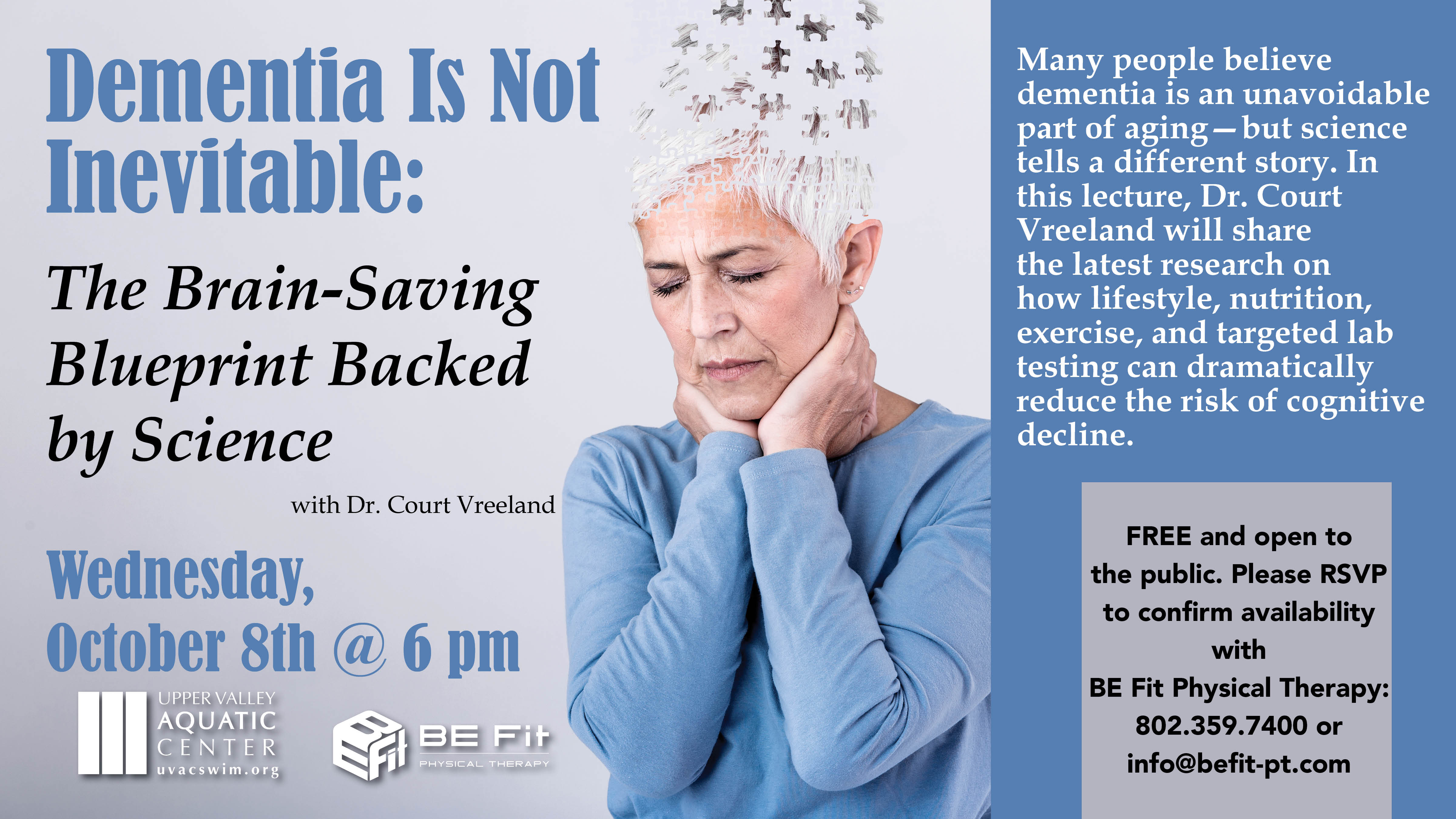 Many people believe dementia is an unavoidable part of aging—but science tells a different story. In this lecture, Dr. Court Vreeland will share the latest research on how lifestyle, nutrition, exercise, and targeted lab testing can dramatically reduce the risk of cognitive decline. You’ll learn which habits protect the brain, which hidden risk factors are often overlooked, and what practical steps you can take right now to preserve memory and mental sharpness. This evidence-based presentation is designed to give you hope, clarity, and a clear blueprint for keeping your brain healthy for years to come.