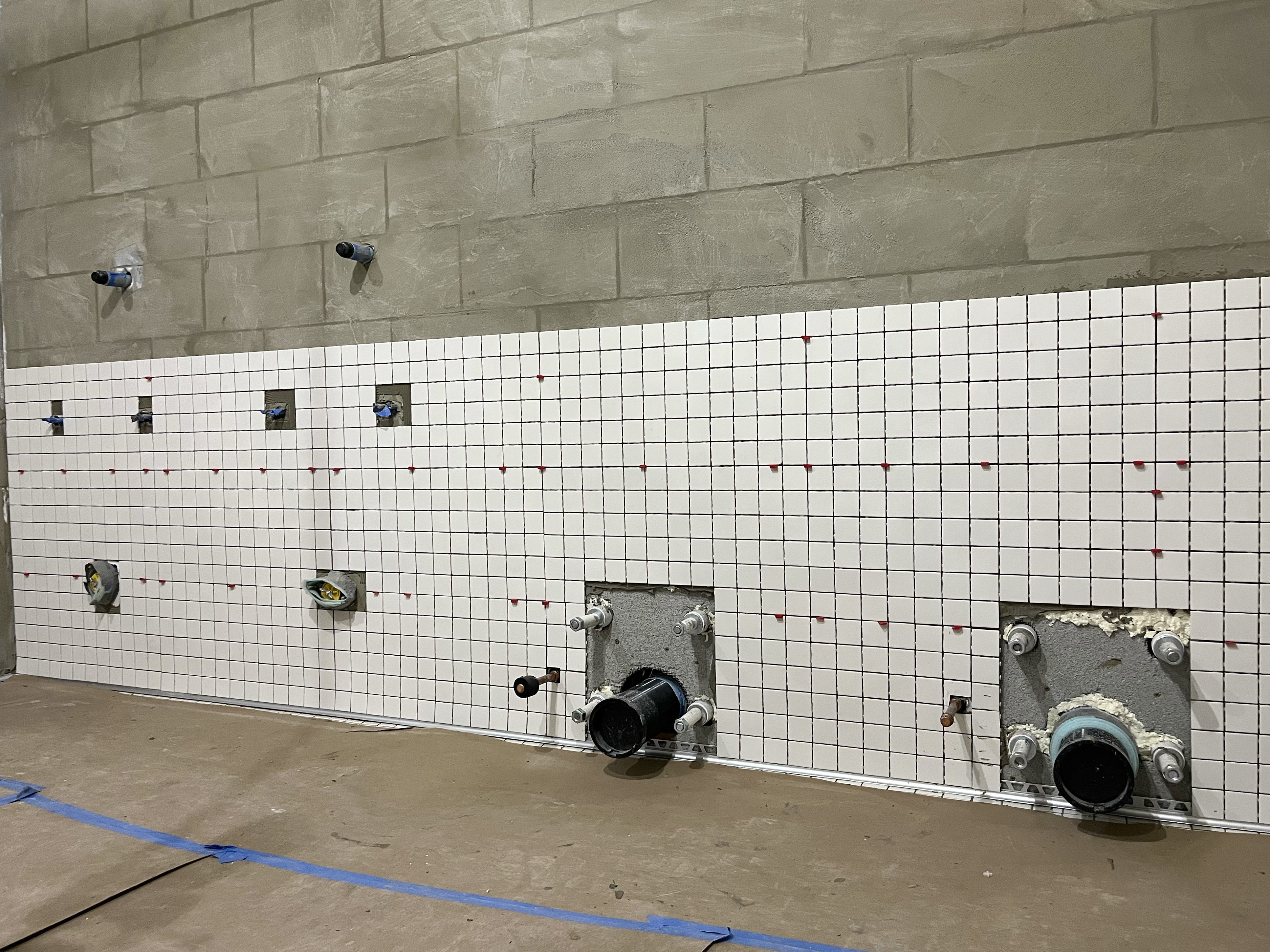 Progress in the locker rooms is moving right along! This week, new tile is being laid in the showers, and work will continue into the bathroom areas. The walls are prepped and ready for sleek solid panels, which are scheduled to be installed next week.