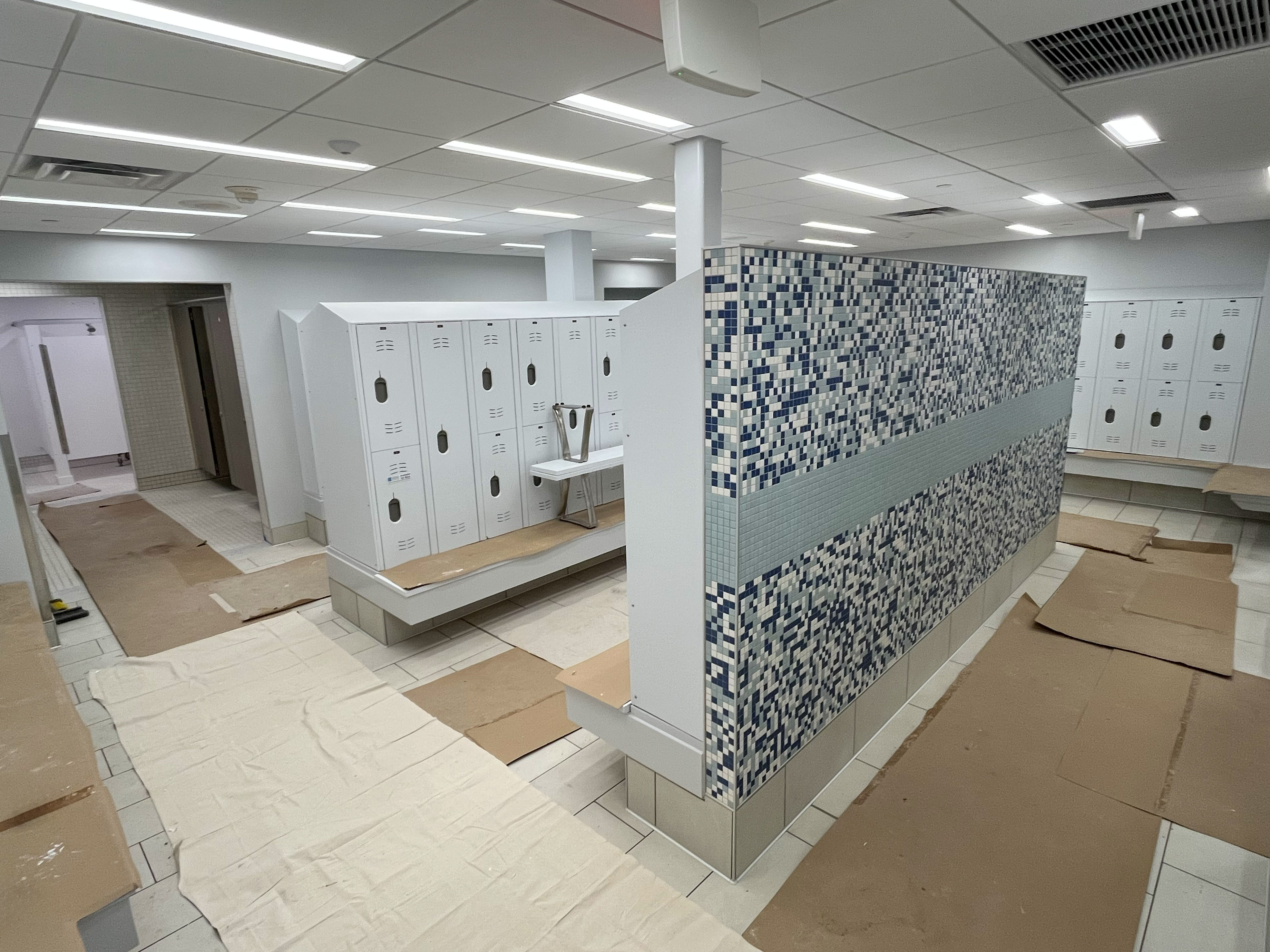 The men's locker room is bustling with progress! The new solid-surface Corian wall tiles are up in the showers, and wall tile work is progressing into the bathroom areas. Floor tile has been laid throughout the shower and bathroom areas, and is safely covered until grouting begins.